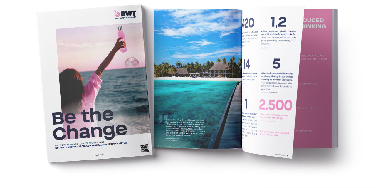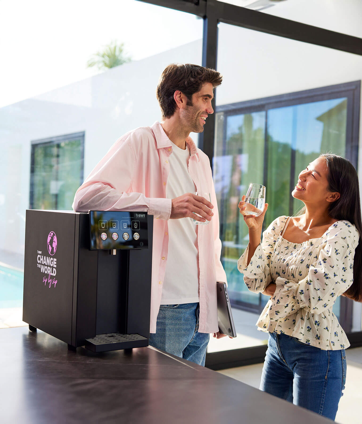 Every single person can contribute to making our planet bluer and less plastic. It's not only a choice but our duty to society, animals, and our children. At BWT, we do this with our globally patented technologies that mineralize local water, so that communities, households, companies, and people can enjoy local water of the best quality directly out of the tap, the table water filter or the water dispenser. BWT products enrich water - with valuable minerals and trace elements such as magnesium, zinc or silicate. This helps us to CHANGE THE WORLD - and helps you to have great tasting, chilled, sparkling or still, local mineralized water at your disposal. Without the need to buy single-use plastic- or glass bottles, producing CO₂ emissions and plastic waste.